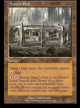 But recently, I found that I wanted to incorporate a little more, and thus, I decided that coincidentally, I had great natural synergy with the Maze’s End Gate cards- my MTG lore is lacking so this may be rong, but the Gates refer to guilds of Ravnica, each a dual combination of the 5 colour factions available, not counting colourless, thus we have 10 combinations. Not only does this help me, as someone who requires a delicate balance of mana colours, but also because I have a deck searching ability for land, as well as an alternative win condition. Truly, this is the greatest partnership since Green Eggs and Ham!
